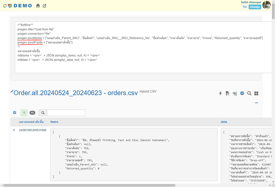pivotFields ใช้สำหรับเลือกคอลัมน์ที่ต้องการยุบรวมกัน เมื่อค่าในคอลัมน์นั้นเหมือนกัน เช่น เลขที่คำสั่งซื้อ