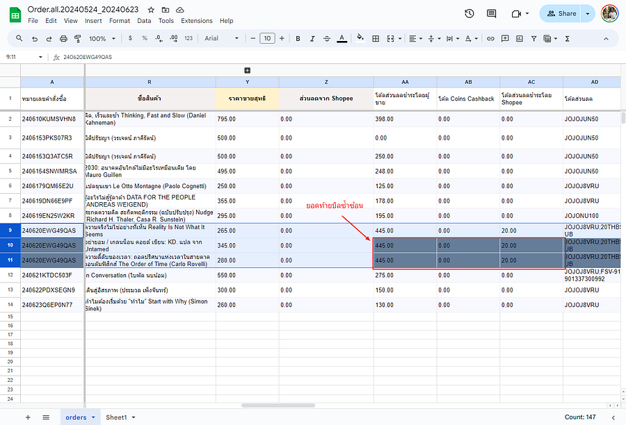 เบิ้ลหรือซ้ำเหมือนกันทุกบรรทัด เช่น ข้อมูลจาก Shopee