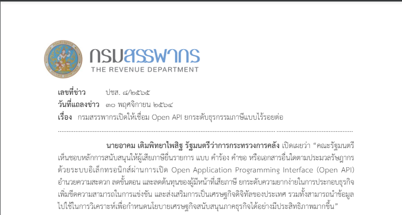 กรมสรรพากร สนับสนุนให้ใช้ Open API https://www.rd.go.th/fileadmin/user_upload/news/2565thai/news8_2565.pdf