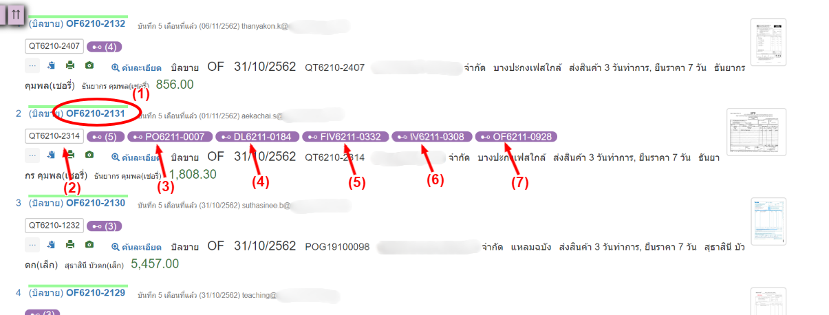 เริ่มต้นจาก ลูกค้าแจ้งสั่งซื้อสินค้า มาที่สำนักงาน ฝ่ายขาย จึงทำ (1) ใบยืนยันขาย OF ที่อ้างถึง (2) ใบเสนอราคา QT พร้อมทั้งแนบภาพถ่ายสำเนาใบสั่งซื้อจากลูกค้าไว้ด้วย หลังจากนั้น ฝ่ายจัดซื้อ พบว่าสินค้าไม่พอจัดส่ง จึงมีการเปิด (3) ใบสั่งซื้อ PO โดยอ้างถึงใบยืนยันขายนี้ ต่อจากนั้น ฝ่ายสโตร์ มีการบันทึก (4) ใบเบิกสินค้า DL เมื่อพร้อม ฝ่ายจัดส่ง จึงทำ (5) ใบส่งสินค้า FIV เพื่อเตรียมส่งสินค้า ขณะเดียวกัน ฝ่ายบัญชี ตรวจสอบรายละเอียดกับสำเนาใบสั่งซื้อ ก็ทำการเปิด (6) ใบกำกับภาษี IV เหตุการณ์หลังจากนั้น จะเห็นว่า มีการสั่งซื้อซ้ำจากลูกค้า ฝ่ายขาย จึงเปิด (7) ใบยืนยันขาย OF ใบใหม่อีกครั้ง