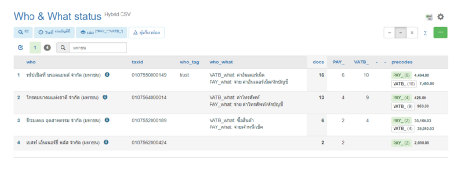 ตัวอย่างการทำงาน โปรแกรมจะมีรายงานแสดงจำนวนธุรกรรมที่เกิดของคู่ค้าแต่ละรายในรอบบัญชี บางรายก็มีแต่จ่าย มักจะเป็นธุรกรรมเงินสดที่จบในตัวเอง บางรายมีทั้งซื้อและจ่าย เห็นความเชื่อมโยงที่ต้องลงบัญชีสองจังหวะ ใช้เจ้าหนี้ หรือค่าใช้จ่ายค้างจ่ายมาพักยอด เนื้อหารายการในเอกสารแสดงให้ทราบว่าควรลงบัญชีเป็นค่าอะไร