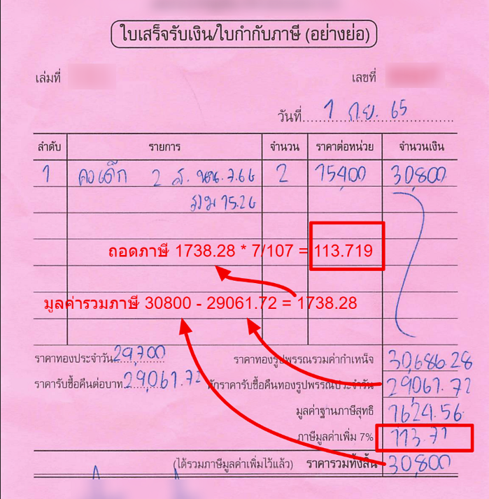 สาม คำนวณถอดตัวเลขภาษีและฐานจากค่ากำเหน็จตามข้อสอง เนื่องจากร้านทองไม่ได้บวกภาษีเพิ่ม จึงต้องถือว่า 5 บาทนั้นรวมภาษีอยู่แล้ว ได้ภาษี 0.33 และฐาน 4.67 นั่นคือการคำนวณแบบปัดเศษขึ้นลงด้วยทศนิยมหลักที่สาม ตามคำแนะนำในประกาศสรรพากร