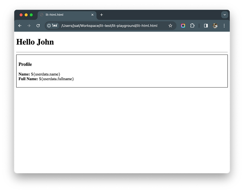 พอเขียน template ด้วยโครงสร้าง HTML แบบนี้ ผมพอจะนึกถึงทางเลือกที่อาจใช้ในการพัฒนาได้มากขึ้น แต่น่าเสียดายผลลัพธ์ที่ได้ก็ไม่ต่างกัน สามารถเอา element ที่สร้างไว้ใน <template> มาใช้ได้ แต่ไม่สามารถประมวลผลแทนค่า ${..}
