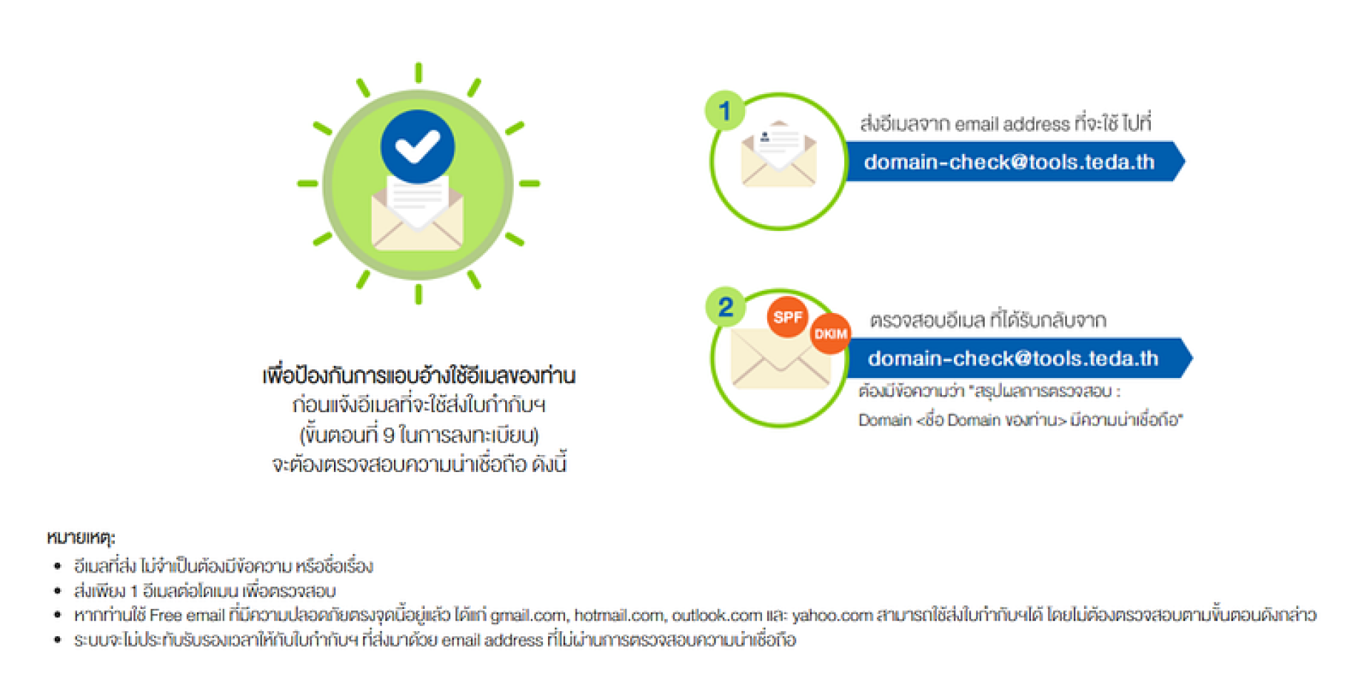 เงื่อนไขหนึ่งของการเปิดใช้ E-Tax Invoice by Email ผู้ประกอบการต้องยื่นคำร้องพร้อมทั้งแจ้งอีเมลที่ใช้ส่งใบกำกับภาษี ซึ่งอีเมลนั้นต้องมาจากโดเมนที่น่าเชื่อถือเท่านั้น โดยการทดลองส่งเมลไปตรวจสอบกับ domain-check@tools.teda.th