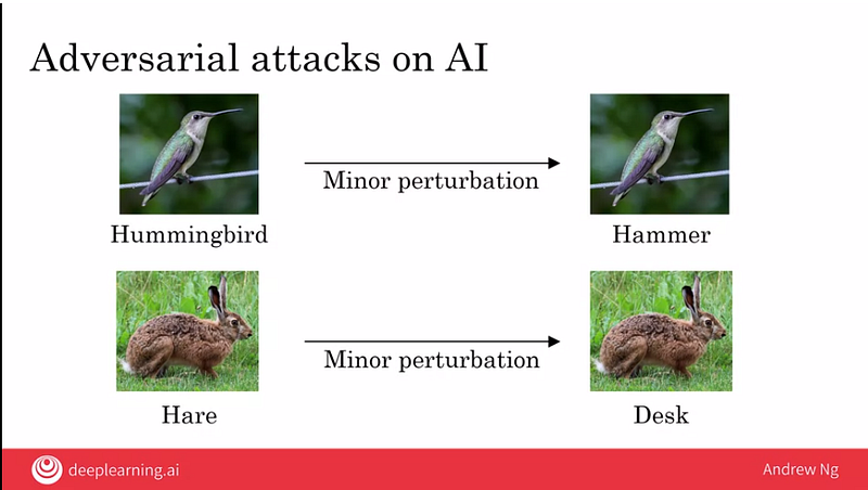 หรืออีกกรณีหนึ่ง เกิดจากถูกสอนด้วยข้อมูลผิด ๆ (Adversarial Attacks) เช่น ให้รูปหมาไปแล้วบอกว่าแมว ทำให้ AI สับสนจนเพี้ยน