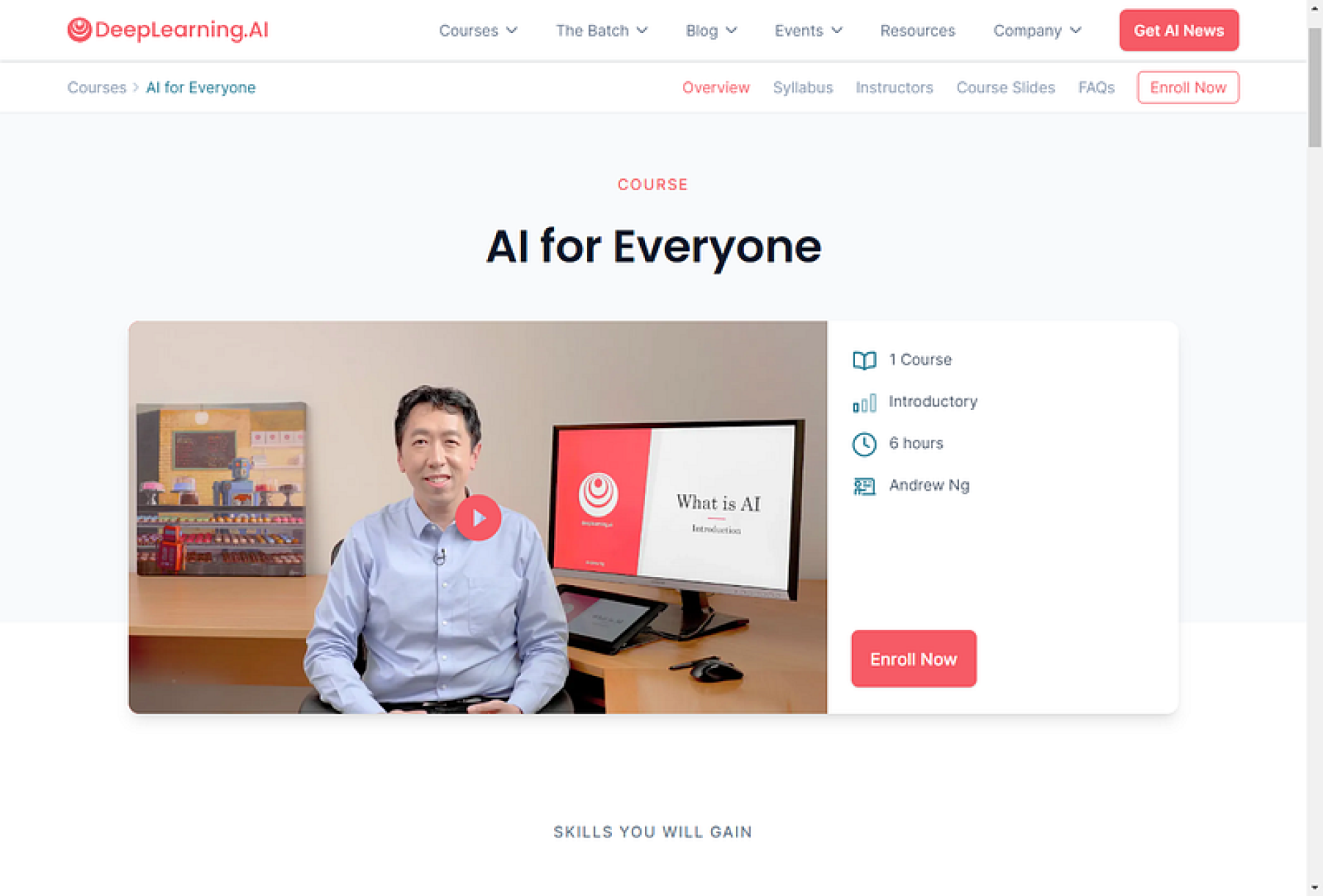 AI for Everyone สอนโดย Andrew Ng สามารถสมัครเรียนฟรีหรือจะเลือกเสียเงินก็ได้ หากต้องการรับ certificate นอกจากเสียเงินแล้วต้องทำแบบฝึกหัดทดสอบท้ายบทให้ผ่านเกณฑ์ด้วย